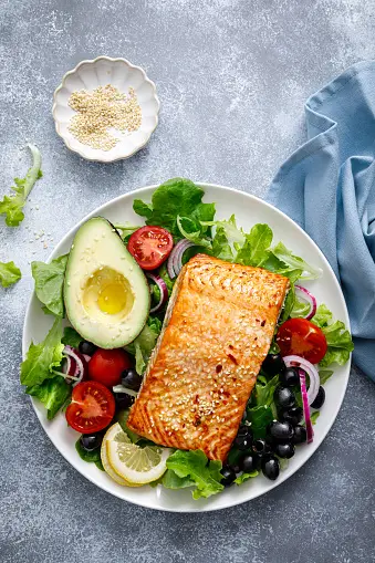 - Side salad with mixed greens, bell peppers, and avocado